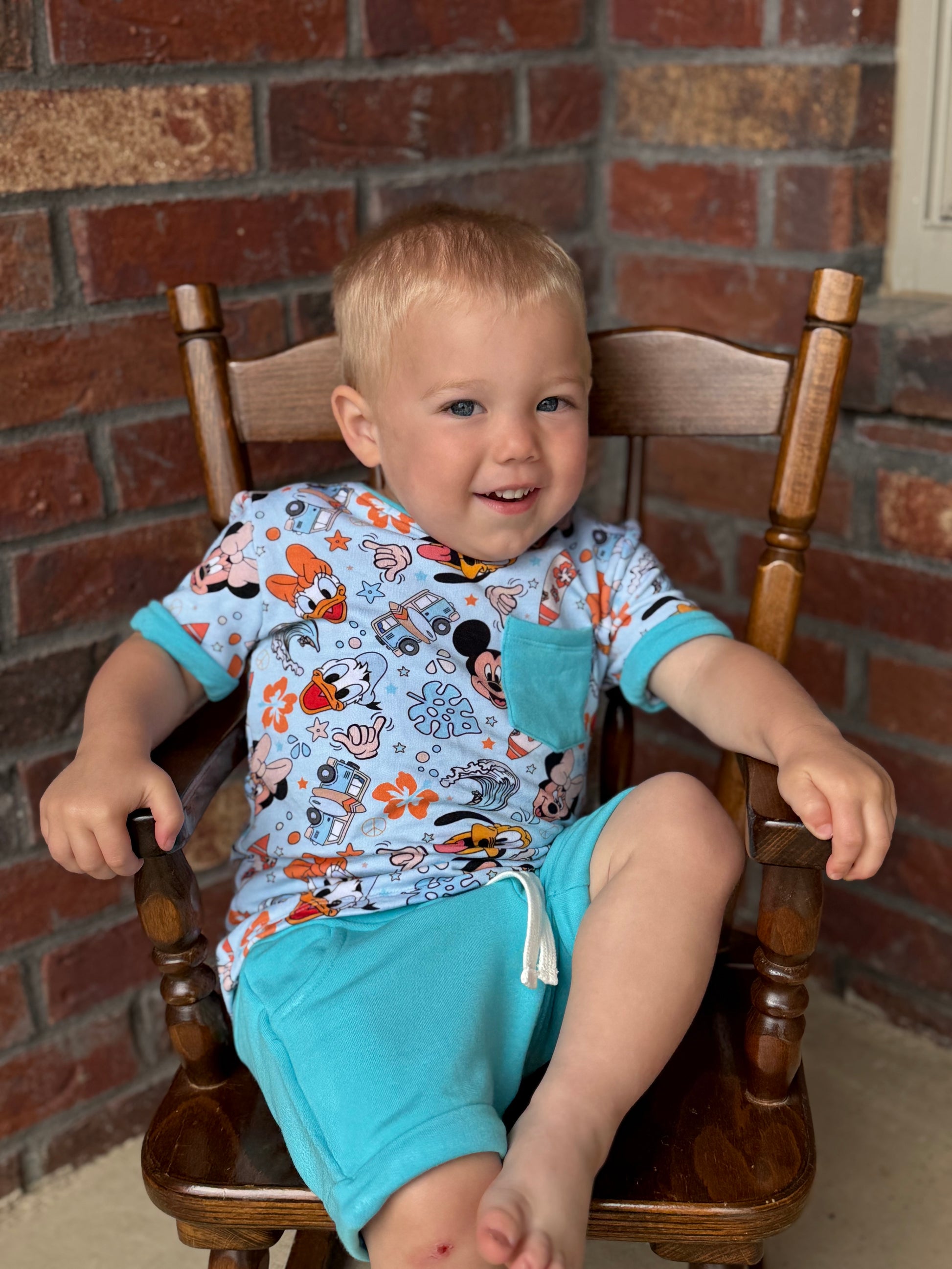 This bamboo/terry set includes a print pocket tee and coordinating solid shorts. The shorts come with a functional drawstring & pockets. They run true to size.